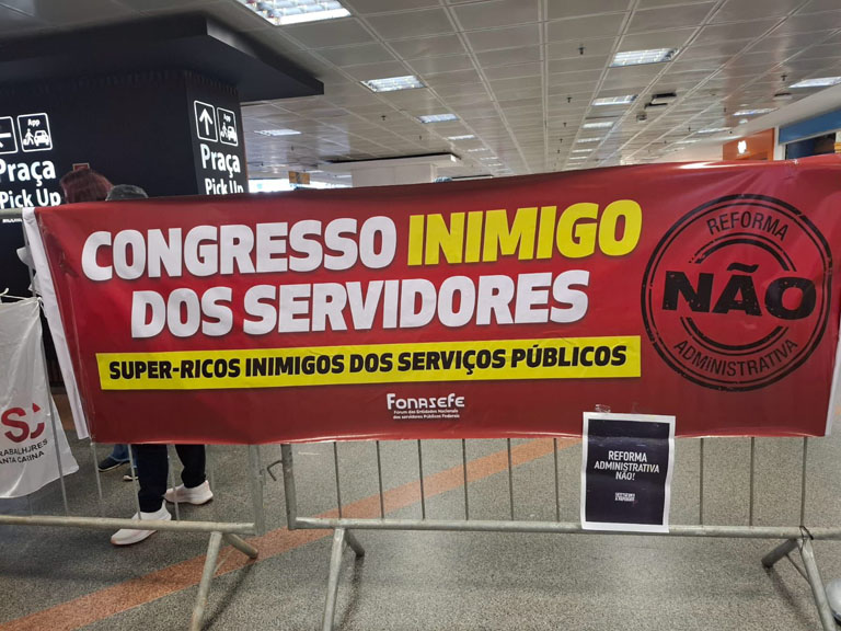 Hoje (08/7) entidades do Fonasefe realizaram protesto na recepção dos parlamentares, no aeroporto internacional de Brasília. A mobilização faz parte da Jornada de luta contra a Reforma Administrativa.