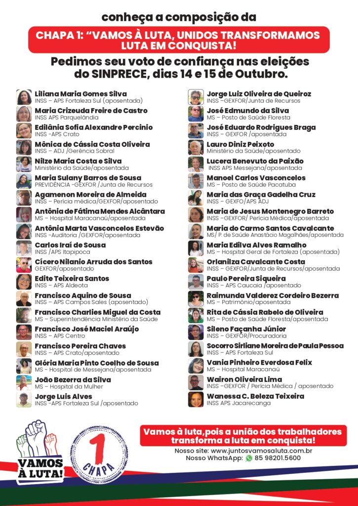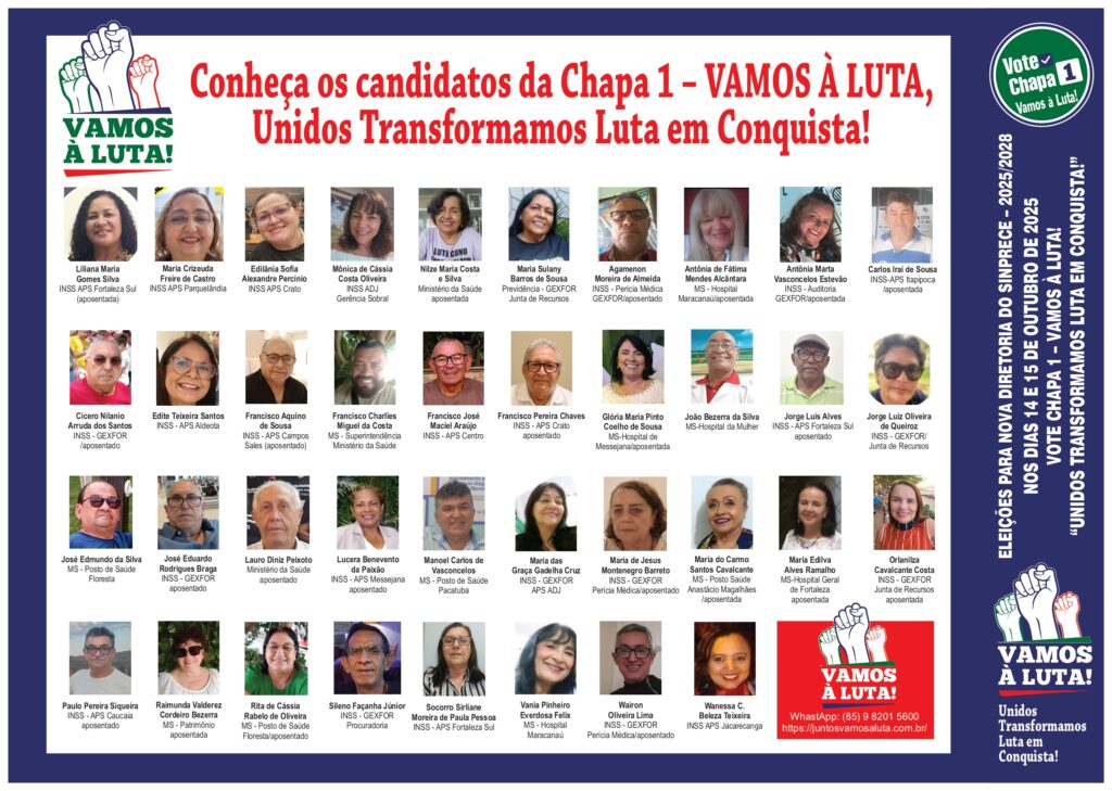 ELEIÇÕES PARA NOVA DIRETORIA DO SINPRECE – TRIÊNIO 2025/2028 CONHEÇA E VOTE CHAPA 1 “VAMOS À LUTA”